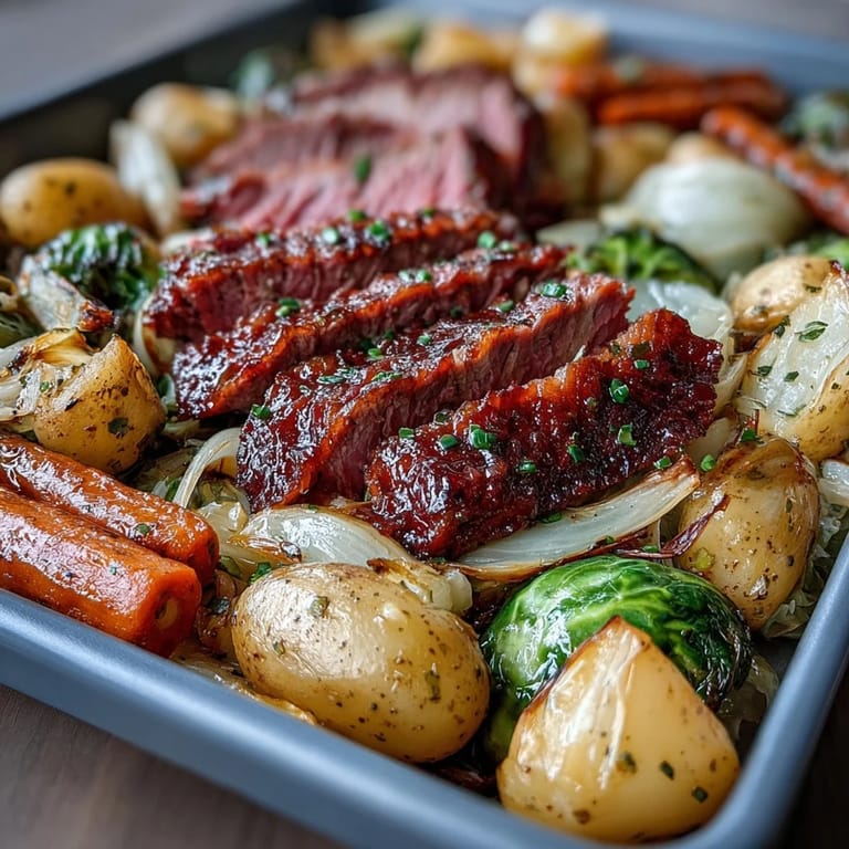 The magic of this dish lies in the oven doing all the hard work. By roasting the vegetables first at 220°C (425°F) and adding the pre-cooked corned beef only in the final 15 minutes, you ensure that the potatoes and carrots become perfectly tender while the beef heats through and picks up those irresistible caramelized edges. A light drizzle of olive oil and a generous seasoning of kosher salt, black pepper, dried thyme, dried parsley, and garlic powder bring everything together into a cohesive, savory plate. A spoonful of whole grain mustard on the side is optional but highly recommended—its slight tang cuts beautifully through the richness of the beef.