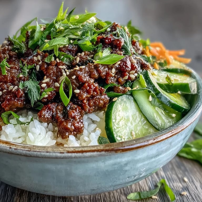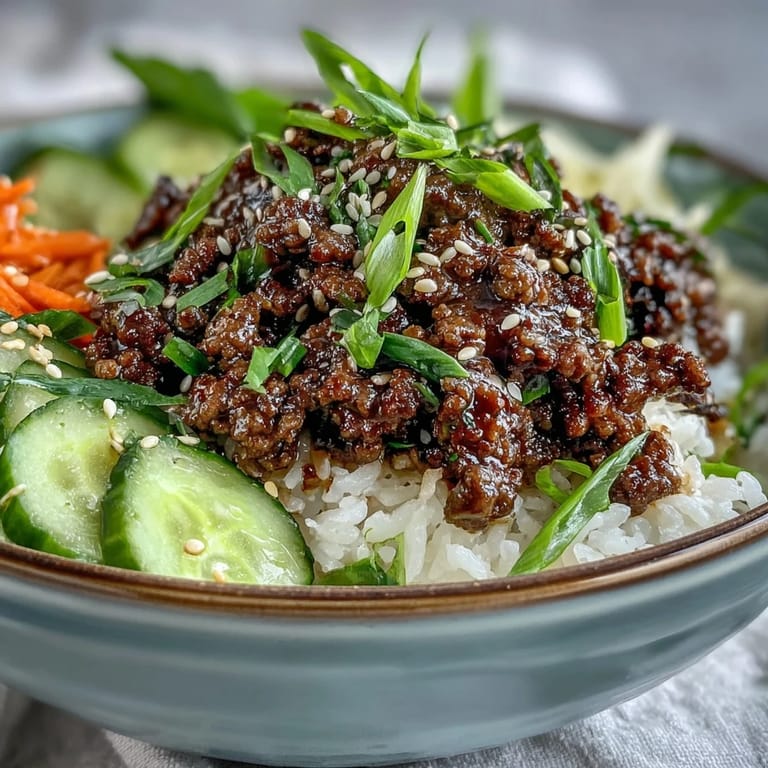 Pinterest My neighbor brought over this Korean ground beef bowl one Tuesday evening, and I watched her assemble it with such casual confidence that I knew I had to learn how to make it myself. The way the warm beef glistened with sesame oil while the pickled vegetables added this bright, sharp contrast felt like eating something both comforting and exciting at the same time. Within a week, I'd made it four times, each batch tasting better as I learned to trust the ginger and garlic to do their work. Now it's become my go-to when I want something that tastes restaurant-quality but comes together faster than I'd expect.