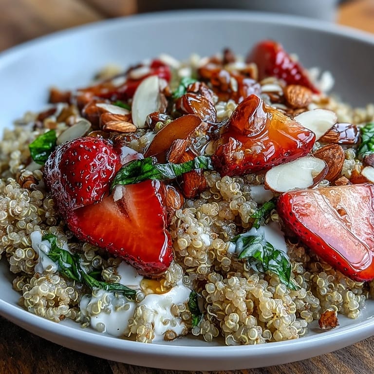 What makes this bowl interesting instead of just healthy is the way every component brings something different to the table. The creamy yogurt, the chewy quinoa, the crispy almonds, and the tiny explosions of chia seeds create this satisfying contrast that keeps you engaged while eating. The cold strawberries against the warm grain, the sweet honey against the bright basil, and that whisper of black pepper that just hints at something unexpected—it all works together to create something more than the sum of its parts. The first time I added the black pepper, I thought I was being too adventurous, but that tiny bit of spice actually unlocks a deeper sweetness in the berries.