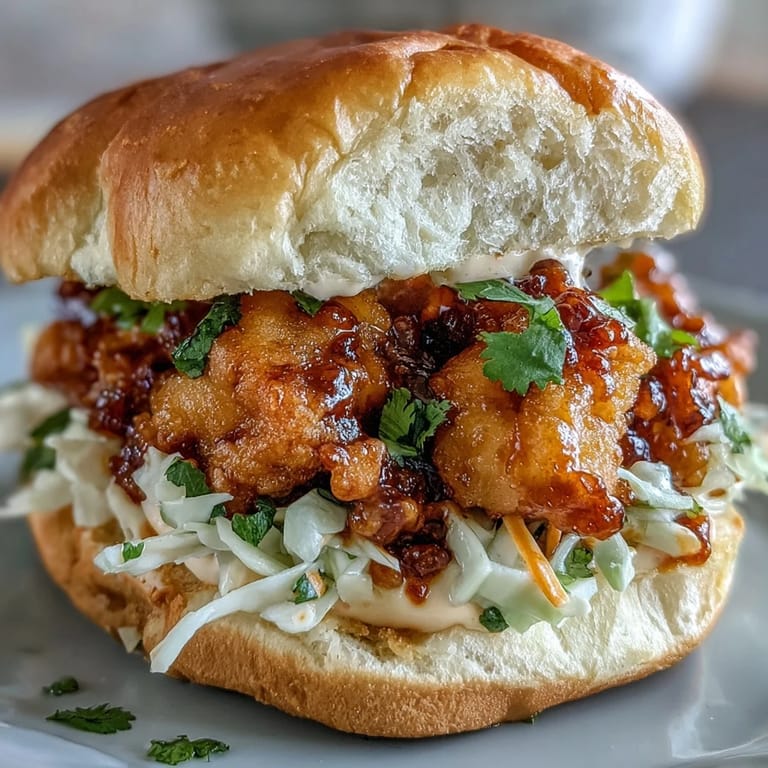 - Spread spicy mayo on both bun halves, then layer with fried chicken, shredded cabbage, pickled carrots, and fresh cilantro before crowning with the top bun.